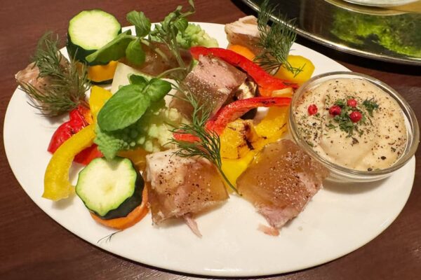 島野菜料理やシャルキュトリー(食肉加工品)類、チーズなどをバランスよく盛り付けられた前菜の盛り合わせ。生ハム以外は全て自家製とのこと。