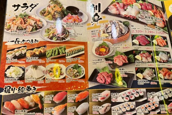 サラダ・一品おつまみ・刺身・肉料理・揚げ物・焼物・炭火炙り・握り・細巻き・ご飯物・ピザ・スイートまで。