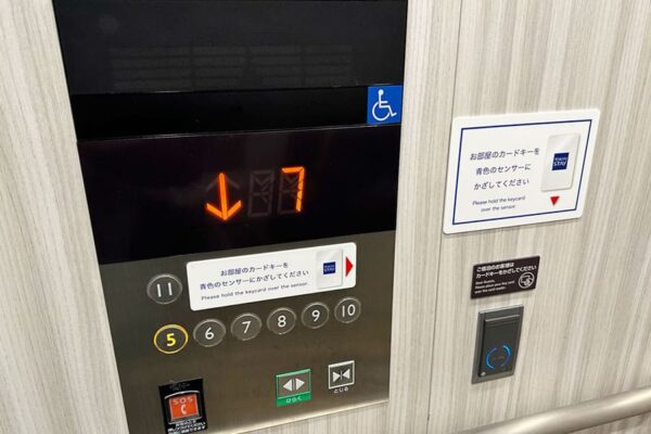 ロビー階がある5階から上へは別のエレベーター。客室階へ行くエレベーターに乗るにはカードキーが必要です。