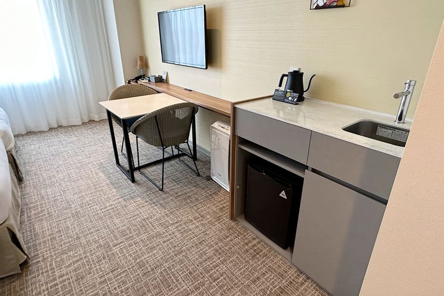 ミニキッチンには電気ケトルと冷蔵庫が置いてありました。